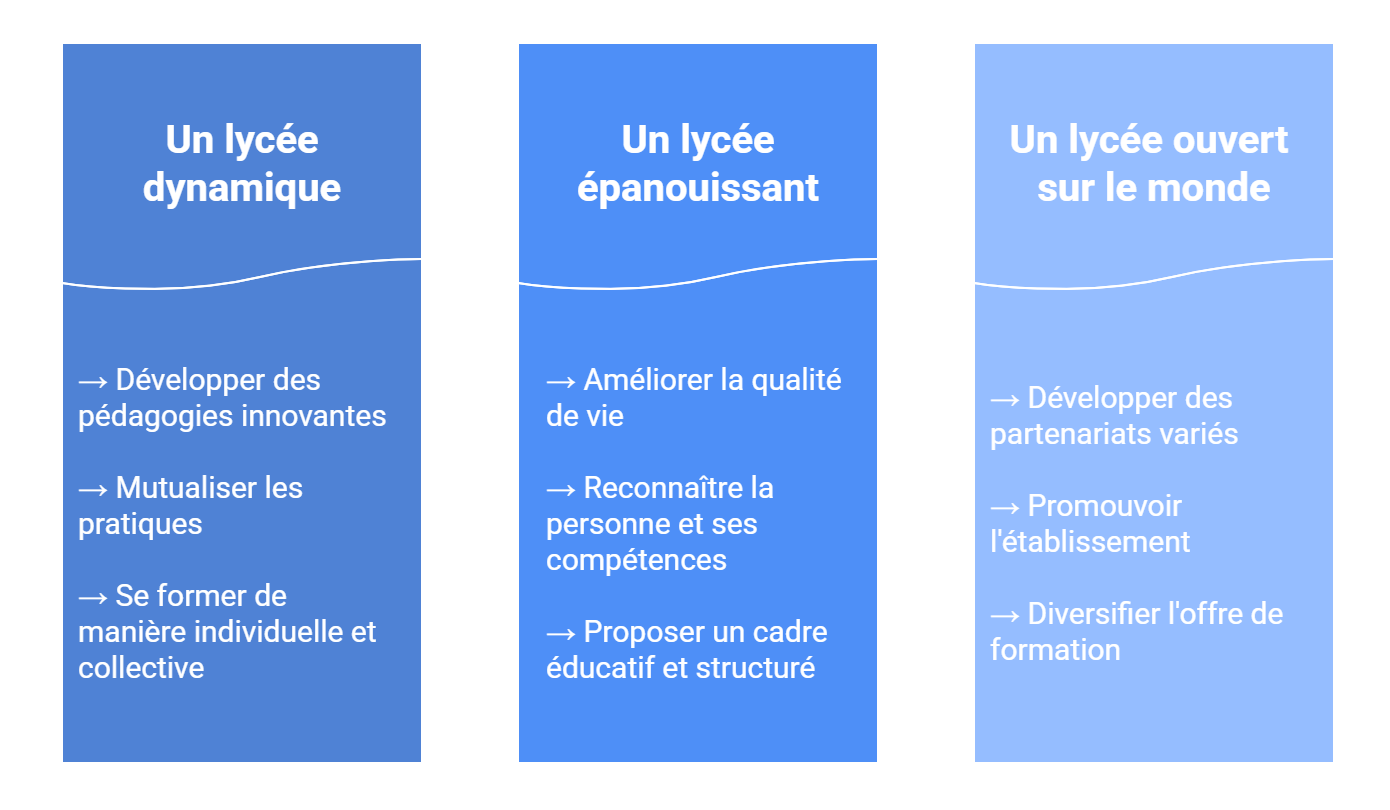 Dans une société en mutation permanente, nous souhaitons être un lycée qui s’appuie sur ses valeurs, sa culture d’établissement et ses ressources pour former, au sein d’un environnement sécurisant, des individus-acteurs en les accompagnant de façon innovante, flexible et dynamique.